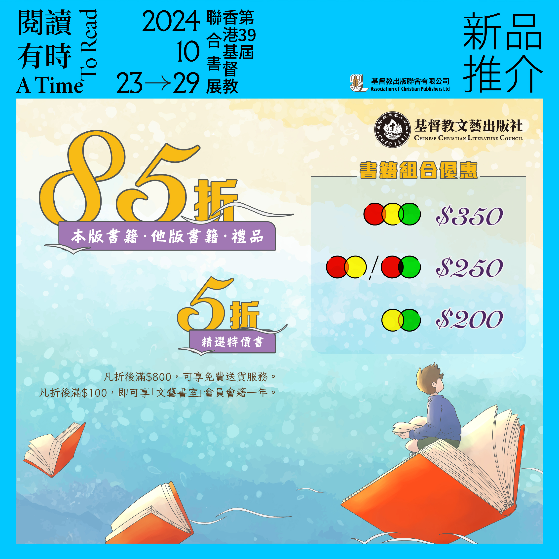 新品推介/基督教文藝出版社 基督教聯合書展2024 內容主題:尋索真理.書海航行書展優惠本版、他版書籍及禮品 一律85折書籍組合優惠-精選書籍 紅+黃+綠各選1本,優惠價 $350-精選書籍 紅+黃 或 紅+綠各選1本,優惠價 $250-精選書籍 黃+綠各選1本,優惠價 $200精選特價書低至半價-凡折後滿$800,可享免費送貨服務。-凡折後滿$100,即可享「文藝書室」會員會籍一年。連結 評分:分享此文:TweetPocket更多 按一下即可以電子郵件傳送連結給朋友(在新視窗中開啟) 電子郵件 點這裡列印(在新視窗中開啟) 列印 在 Tumblr 上分享喜歡 正在載入...