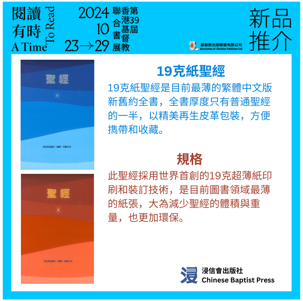 新品推介/浸信會出版社 基督教聯合書展2024 內容19克紙聖經, 19克紙聖經是目前最薄的繁體中文版新舊約全書,全書厚度只有普通聖經的一半,以精美再生皮革包裝,方便擕帶和收藏。封面圖案為一道江河,寓意神的話語成為生命的活水江河;右下方的魚則表達出得人如得魚的期盼。 深願這本19克紙的聖經,不獨成為我們的珍藏,更讓我們每天沉浸在神的話語中,散發基督的香氣,榮神益人,並能將祂的話和愛傳給身邊人,得人如得魚。(本產品於書展場內有特別優惠)連結 評分:分享此文:TweetPocket更多 按一下即可以電子郵件傳送連結給朋友(在新視窗中開啟) 電子郵件 點這裡列印(在新視窗中開啟) 列印 在 Tumblr 上分享喜歡 正在載入...
