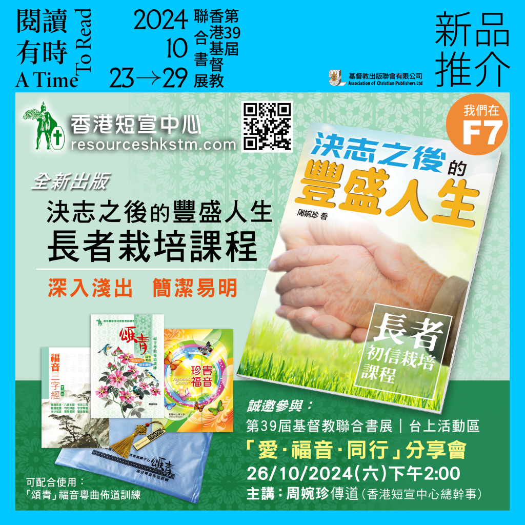 新品推介/香港短宣中心 基督教聯合書展2024 內容【短宣中心全新出版|決志之後的豐盛人生- 長者初信栽培課程 】屬靈生命是要成長的。作者根據長者的成長需要,編輯一套全新的栽培課程。本課程深入淺出、易學易明,幫助長者明白基督徒的生活及其原則。作者將於是次聯合書展的台上活動區簡單講解本課程的用法,誠邀大家出席。「愛.福音.同行」分享會日期:26/10/2024(六) 下午2時主講:周婉珍傳道(香港短宣中心總幹事)連結 評分:分享此文:TweetPocket更多 按一下即可以電子郵件傳送連結給朋友(在新視窗中開啟) 電子郵件 點這裡列印(在新視窗中開啟) 列印 在 Tumblr 上分享喜歡 正在載入...