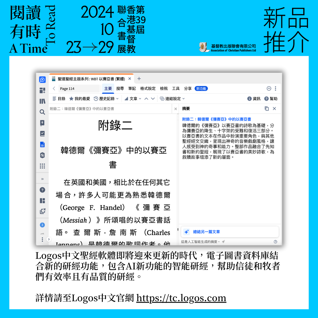 新品推介/Logos中文聖經軟體 基督教聯合書展2024 內容基督教基本要理叢書:Logos中文最新獨家翻譯圖書,本套圖書為信徒基礎造就,以基本要理為主題,有洗禮、神的話語、主禱文、使徒信經、十誡等五大主題。Logos中文聖經軟體即將迎來更新的時代,電子圖書資料庫結合新的研經功能,包含AI新功能的智能研經,包含圖書摘要、講章大綱和查經教案編輯器…等,幫助信徒和牧者們有效率且有品質的研經。連結 評分:分享此文:TweetPocket更多 按一下即可以電子郵件傳送連結給朋友(在新視窗中開啟) 電子郵件 點這裡列印(在新視窗中開啟) 列印 在 Tumblr 上分享喜歡 正在載入...