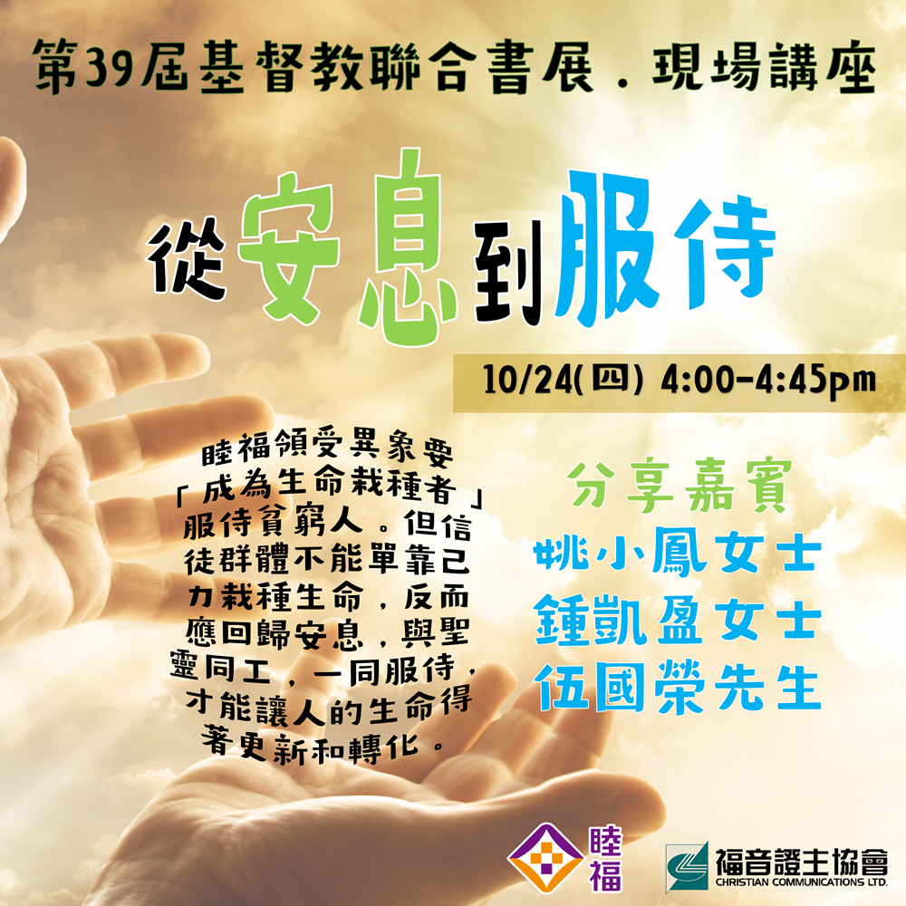 台上活動區/福音證主協會 基督教聯合書展2024 評分:分享此文:TweetPocket更多 按一下即可以電子郵件傳送連結給朋友(在新視窗中開啟) 電子郵件 點這裡列印(在新視窗中開啟) 列印 在 Tumblr 上分享喜歡 正在載入...