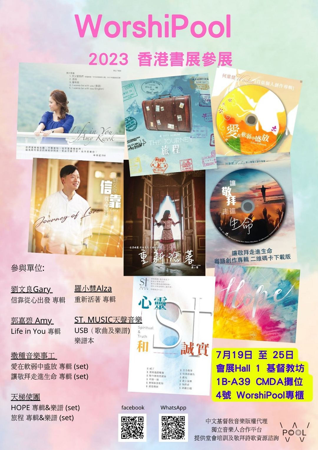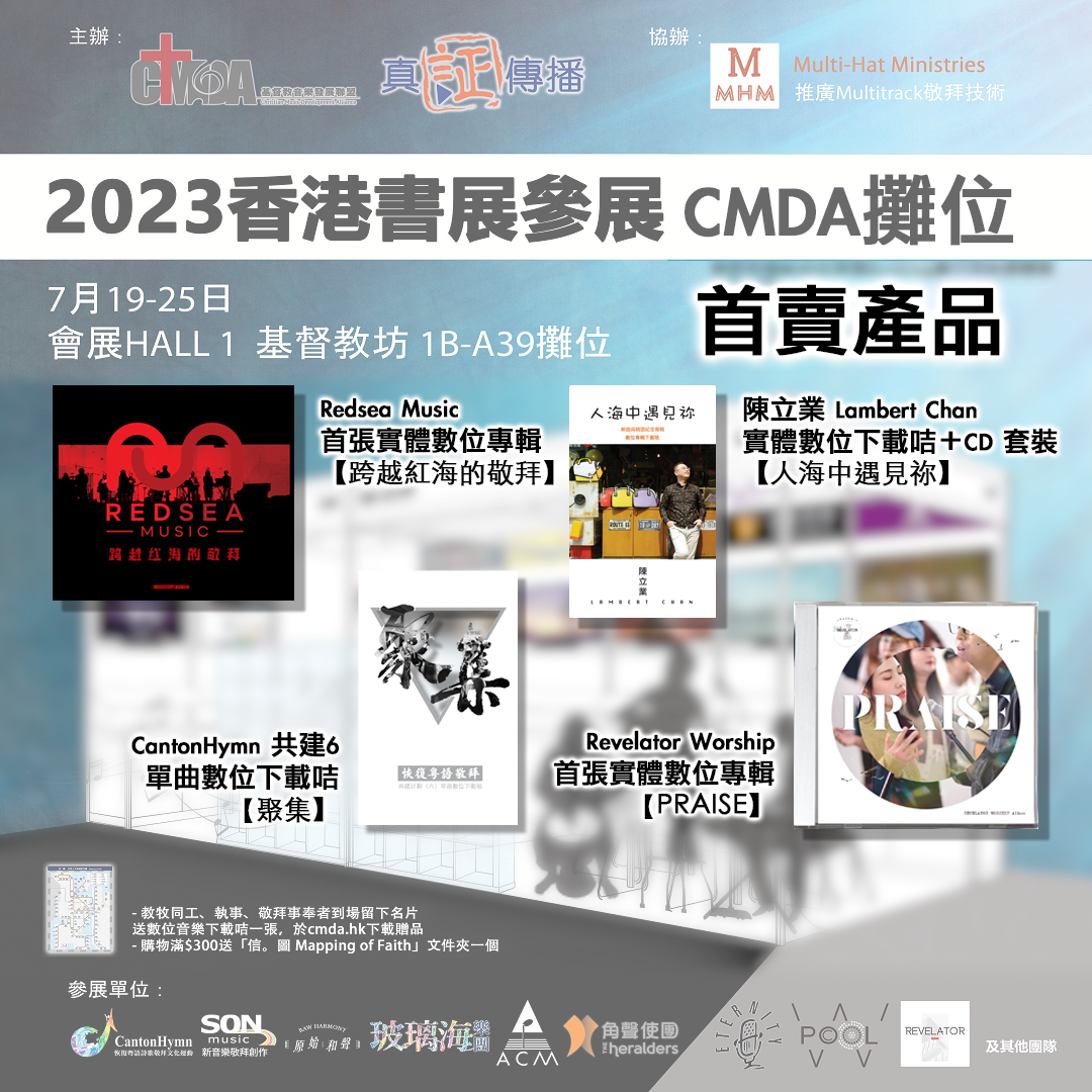 ![]() | CMDA基督徒音樂發展聯盟 x 真証傳播 – 2023 香港書展 參展 – CMDA攤位 首賣產品包括: – Redsea Music 首張實體數位專輯【跨越紅海的敬拜】 – CantonHymn 共建6 單曲數位下載咭【聚集】 – 陳立業 Lambert Chan 實體數位下載咭+CD 套裝 【人海中遇見祢】 – Revelator Worship首張實體數位專輯【PRAISE】 CMDA網上詩歌資源平台,能讓大家在網上選購最新的詩歌、樂譜、多聲道音軌、聯合版權年費,也有最新基督教音樂資訊。 計劃在每年香港書展推廣基督教音樂,實體基督教音樂產品及現場Busking讓不同音樂團隊分享音樂。 1號專櫃:Eternity Music Ministry – EMM 永恆音樂事工 2號專櫃:原始和聲 Raw Harmony 3號專櫃:玻璃海樂團 4號專櫃:WorshiPool 5號專櫃: CantonHymn 恢復粵語詩歌敬拜文化運動 / Son Music 新音樂敬拜創作 6號專櫃:角聲使團 The Heralders 7號專櫃:HKACM 香港基督徒音樂事工協會 及其他團隊 – 教牧同工、執事、敬拜事奉者到場留下名片送數位音樂下載咭一張,於 cmda.hk 下載贈品 – 購物滿$300 送「信。圖 Mapping of Faith」文件夾一個 – 購物滿指定金額 送玻璃海樂團3.5「Psalm.5」專輯 或 JczBand 「Lost & Found」專輯一隻,送完即止 2023香港書展 日期:7月19-25日 位置: 會展HALL 1 基督教坊 1B-A39 CMDA/真証傳播攤位 |