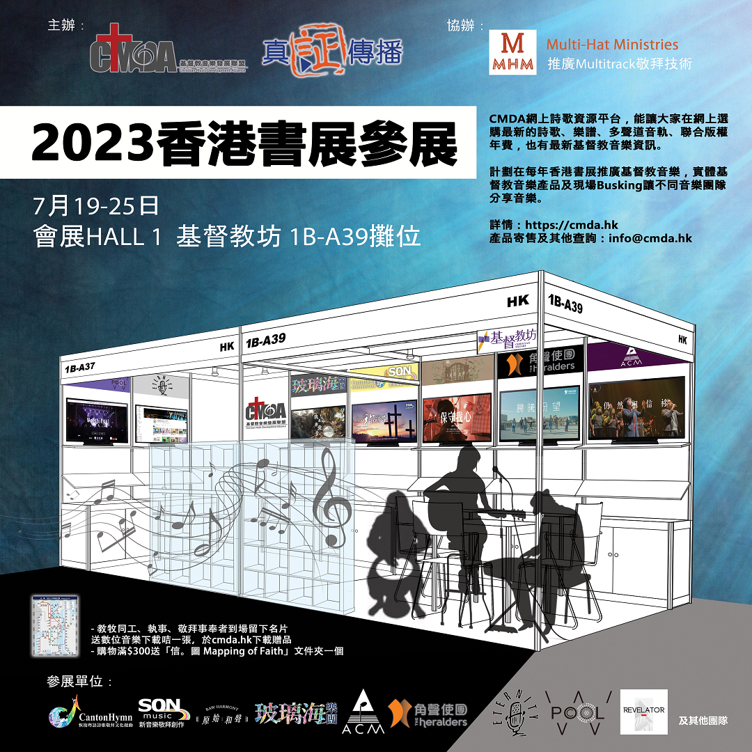 ![]() | CMDA基督徒音樂發展聯盟 x 真証傳播 – 2023 香港書展 參展 – 日期:7月19-25日 位置: 會展HALL 1 基督教坊 1B-A39攤位 CMDA網上詩歌資源平台,能讓大家在網上選購最新的詩歌、樂譜、多聲道音軌、聯合版權年費,也有最新基督教音樂資訊。 計劃在每年香港書展推廣基督教音樂,實體基督教音樂產品及現場Busking讓不同音樂團隊分享音樂。 1號專櫃:Eternity Music Ministry – EMM 永恆音樂事工 2號專櫃:原始和聲 Raw Harmony 3號專櫃:玻璃海樂團 4號專櫃:WorshiPool 5號專櫃: CantonHymn 恢復粵語詩歌敬拜文化運動 / Son Music 新音樂敬拜創作 6號專櫃:角聲使團 The Heralders 7號專櫃:HKACM 香港基督徒音樂事工協會 及其他團隊 – 教牧同工、執事、敬拜事奉者到場留下名片送數位音樂下載咭一張,於cmda.hk下載贈品 – – 購物滿$300送「信。圖 Mapping of Faith」文件夾一個 協辦:MHM(Multi-Hat Ministries)推廣Multitrack敬拜技術 詳情:https://cmda.hk 產品寄售及其他查詢:info@cmda.hk |