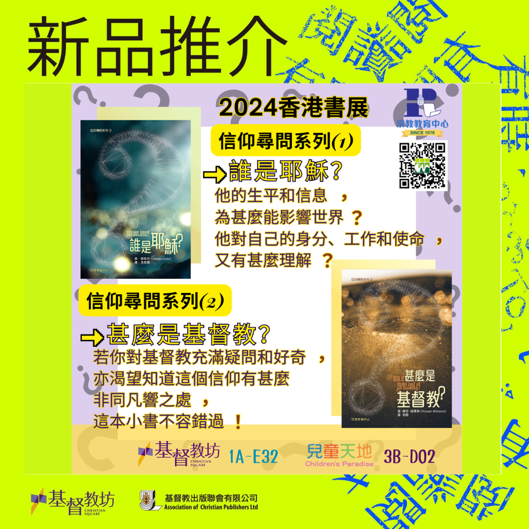 ![]() | 「信仰尋問系列」 名家編撰,言簡意賅 《誰是耶穌?》 新約學者鄧雅各(James Dunn)把拿撒勒人耶穌的故事娓娓道來。 《甚麼是基督教》 羅雲.威廉斯大主教(Rowan Williams)引領你了解基督教對信徒和整個世界的意義。 立即試閱: 誰是耶穌? 甚麼是基督教? 購買及試閱連結 |