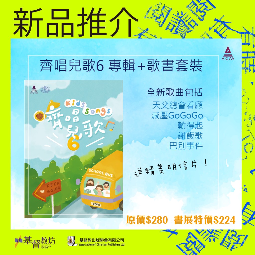 齊唱兒歌6專輯+歌書套裝,全新歌曲包括天父總會看顧、減壓GoGoGo、輸得起、謝飯歌、巴別事件,趣味與真理並重,鼓勵小朋友心靈強健,靠天父感恩每一天。專輯使用下載碼形式出售,下載MP3檔案。原價$280,書展特價$224。