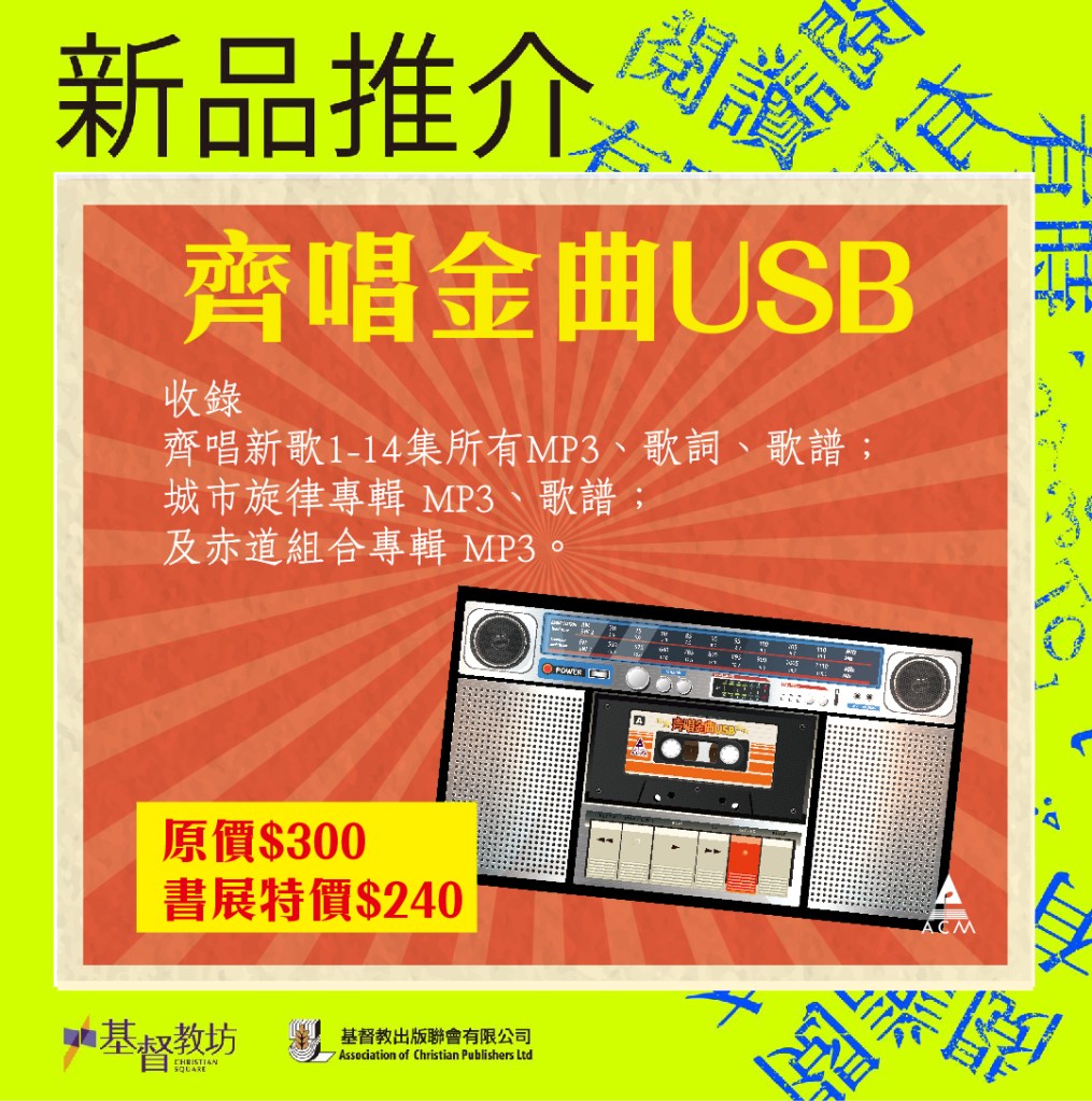 40年來,ACM詩歌伴隨幾代信徒成長,成為很多弟兄姊妹心靈的鼓勵。隨著時代變遷,ACM將詩歌收錄於USB,方便使用不同媒介播放。收錄:齊唱新歌1-14集所有MP3、歌詞、歌譜;城市旋律專輯 MP3、歌譜;及赤道組合專輯 MP3。原價$300,書展特價$240。