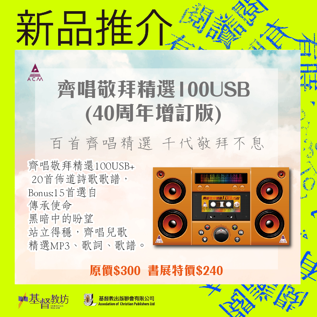 齊唱敬拜精選100USB (40周年增訂版),「百首齊唱精選 千代敬拜不息」,齊唱敬拜精還100USB+ 20首佈道詩歌歌譜,Bonus:15首(傳承使命-站立得穩,齊唱兒歌)精選MP3、歌詞、歌譜。原價$300,書展特價$240。