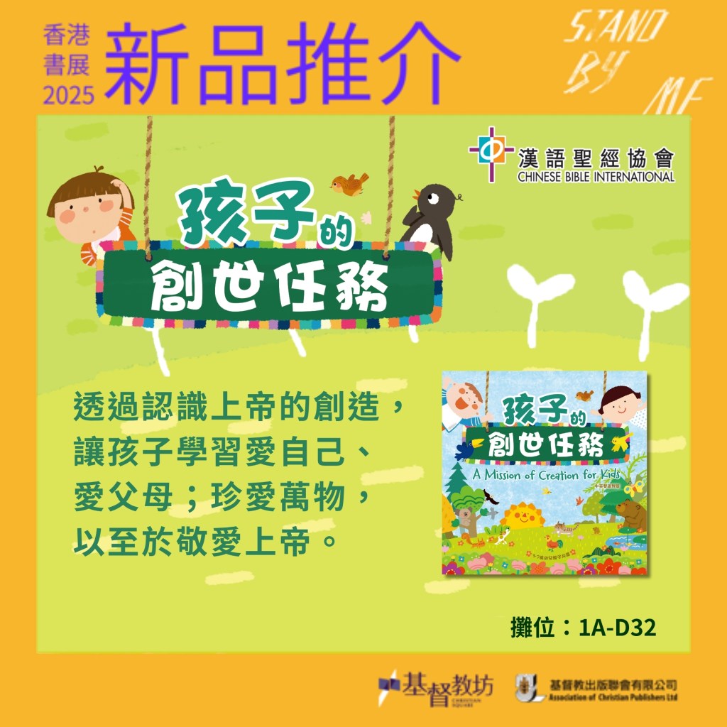 - 本會編輯將會在書展的「有say講場 」中介紹新書《孩子的創世任務》,逐步講解親子閱讀的重要性與方法:如何透過講故事讓孩子認識上帝的創造,玩小任務引發孩子思考和情感共鳴,從而建立為生命感恩、珍惜萬物和生命的聖經價值觀。