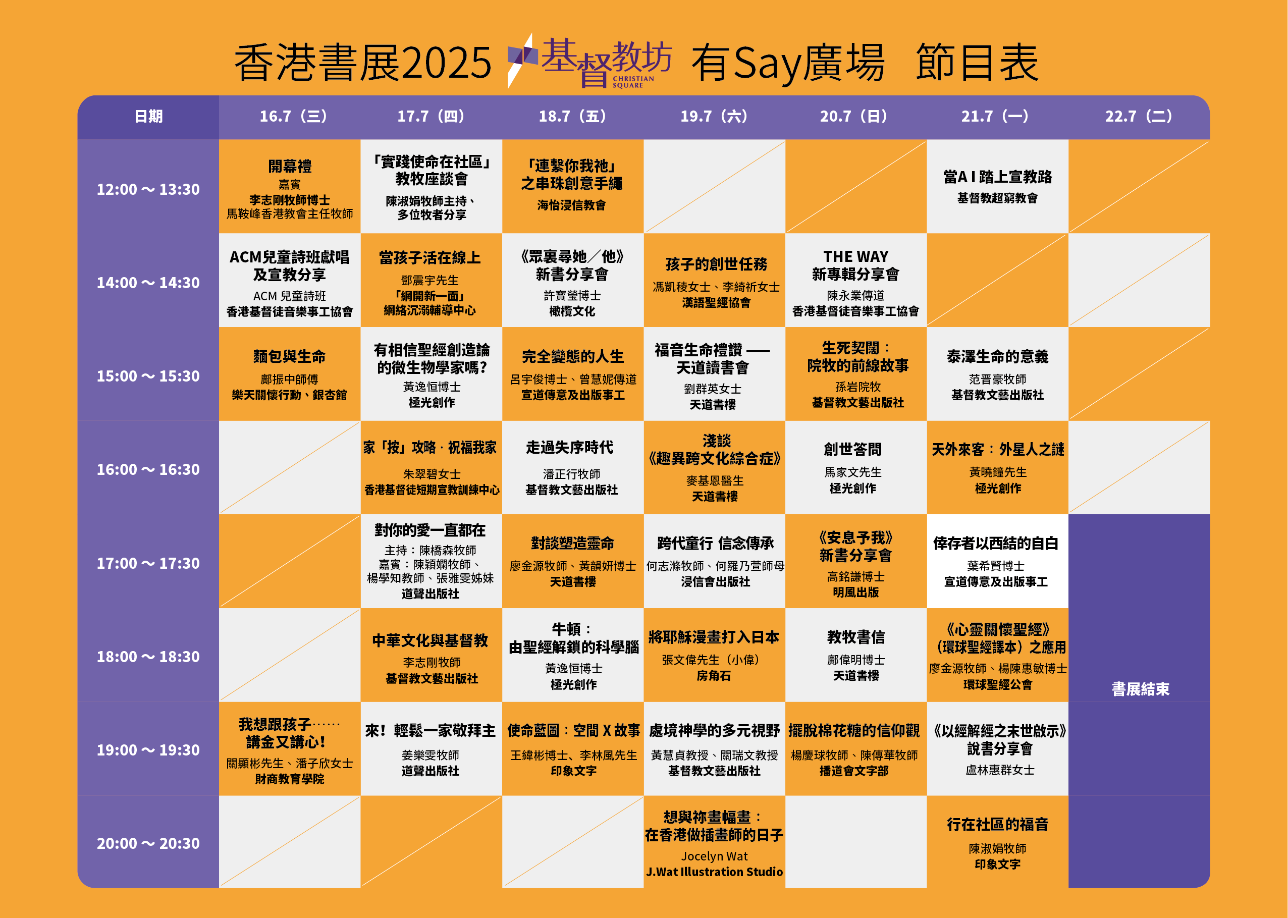 | 19:00 – 19:30 | 我想跟孩子⋯⋯ 講金又講心! 財商教育學院、 財商教育慈善基金會 關顯彬校長 潘子欣總監 | 來!輕鬆一家敬拜主 道聲出版社 姜樂雯牧師 | 使命藍圖:空間 X 故事 新書發佈 印象文字 王緯彬博士 李林風先生 |