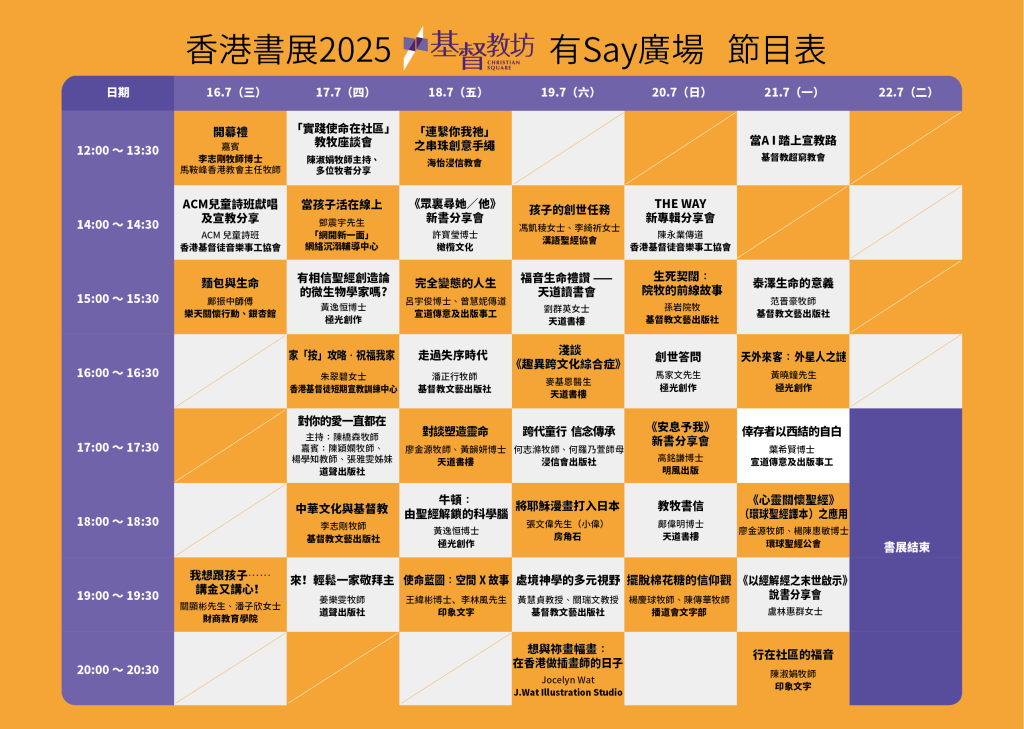 | 19:00 – 19:30 | 處境神學的多元視野 基督教文藝出版社 黃慧貞教授 關瑞文教授 | 擺脫棉花糖的信仰觀 新書發佈 播道會文字部 楊慶球牧師 陳傳華牧師 | 《以經解經之末世啟示》說書分享會 盧林惠群女士 |