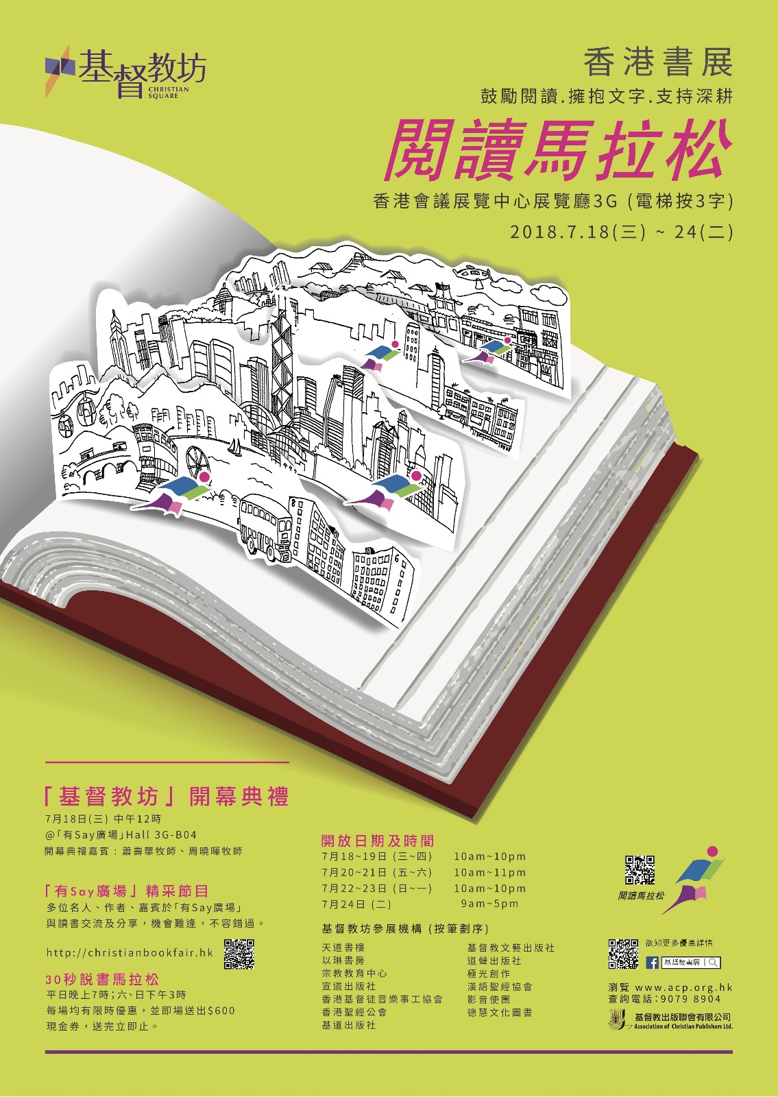 2018香港書展「基督教坊」 香港書展「基督教坊」 日期:2018年7月18-24日 「基督教坊」開幕典禮 日期:7月18日(三) 時間:中午12時 地點:Hall 3G-B04 「有Say廣場」 評分:分享此文:Tweet更多 以電子郵件將連結傳送給朋友(在新視窗中開啟) 電子郵件 列印(在新視窗中開啟) 列印 在 Tumblr 上分享喜歡 正在載入...