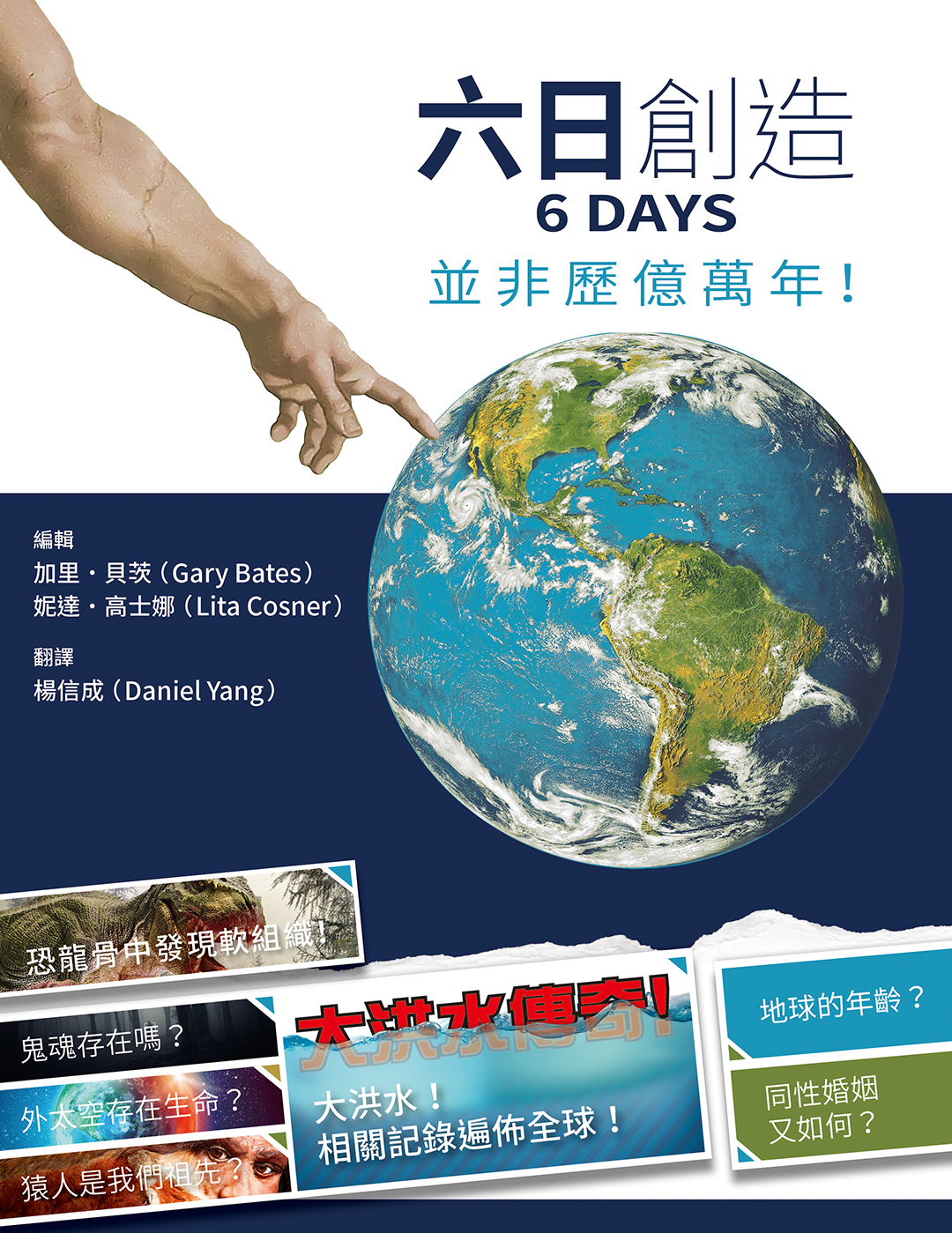 《六日創造》(6 Days)以便於閱讀並富趣味的雜誌式排版,展示26篇關於聖經創造論的文章,涵蓋了很多人都想知道的主題。例如我們應該怎樣看待鬼魂和外星人之說?為什麼一個慈愛的上帝會容許死亡和痛苦? 挪亞怎樣把動物安置在方舟上?放射性測年法的原理是怎樣?神在其他星球也創造了生命嗎?同性婚姻,又如何?誰創造了神?神在其他星球也創造了生命嗎?創世記第一章的「日」有多長?這本書很適合家庭、教會和青年團契一起閱讀。