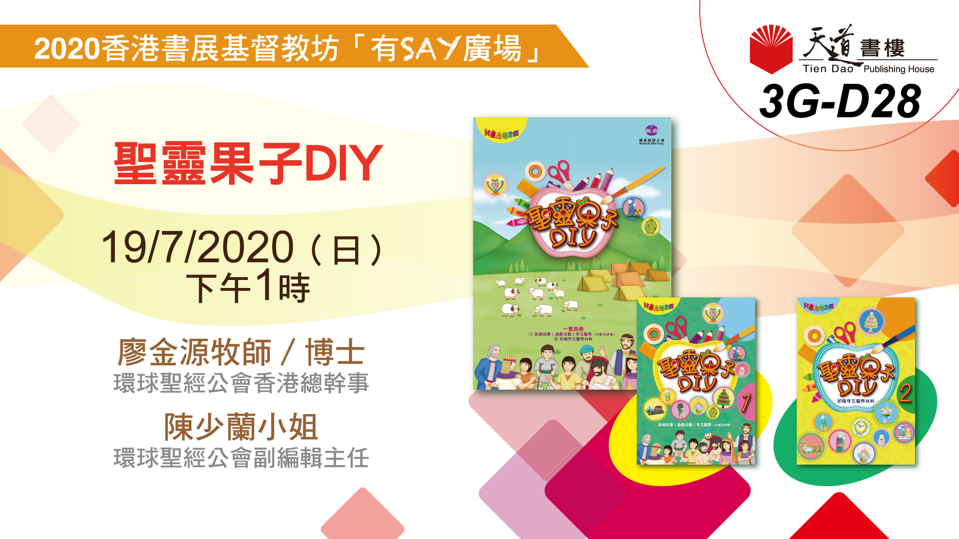 聖靈果子DIY Posted on 2020/06/01 by acpbookfair 香港書展2020|基督教坊有SAY廣場(Hall 3G-D02) 7月19日(日) 下午1:00-1:30 ▍聖靈果子DIY 主講:陳少蘭小姐(環球聖經公會副編輯主任) 內容:介紹《兒童品格聖經:聖靈果子DIY》(一套兩冊+文件夾),講解如何藉遊戲和習作,培養3歲以上孩童的綜合能力及屬靈品格,活動包括:問答遊戲及手工製作示範。 負責機構:環球聖經公會(3G-D28) 評分:分享此文:TweetPocket更多 按一下即可以電子郵件傳送連結給朋友(在新視窗中開啟) 電子郵件 點這裡列印(在新視窗中開啟) 列印 在 Tumblr 上分享喜歡 正在載入... 相關