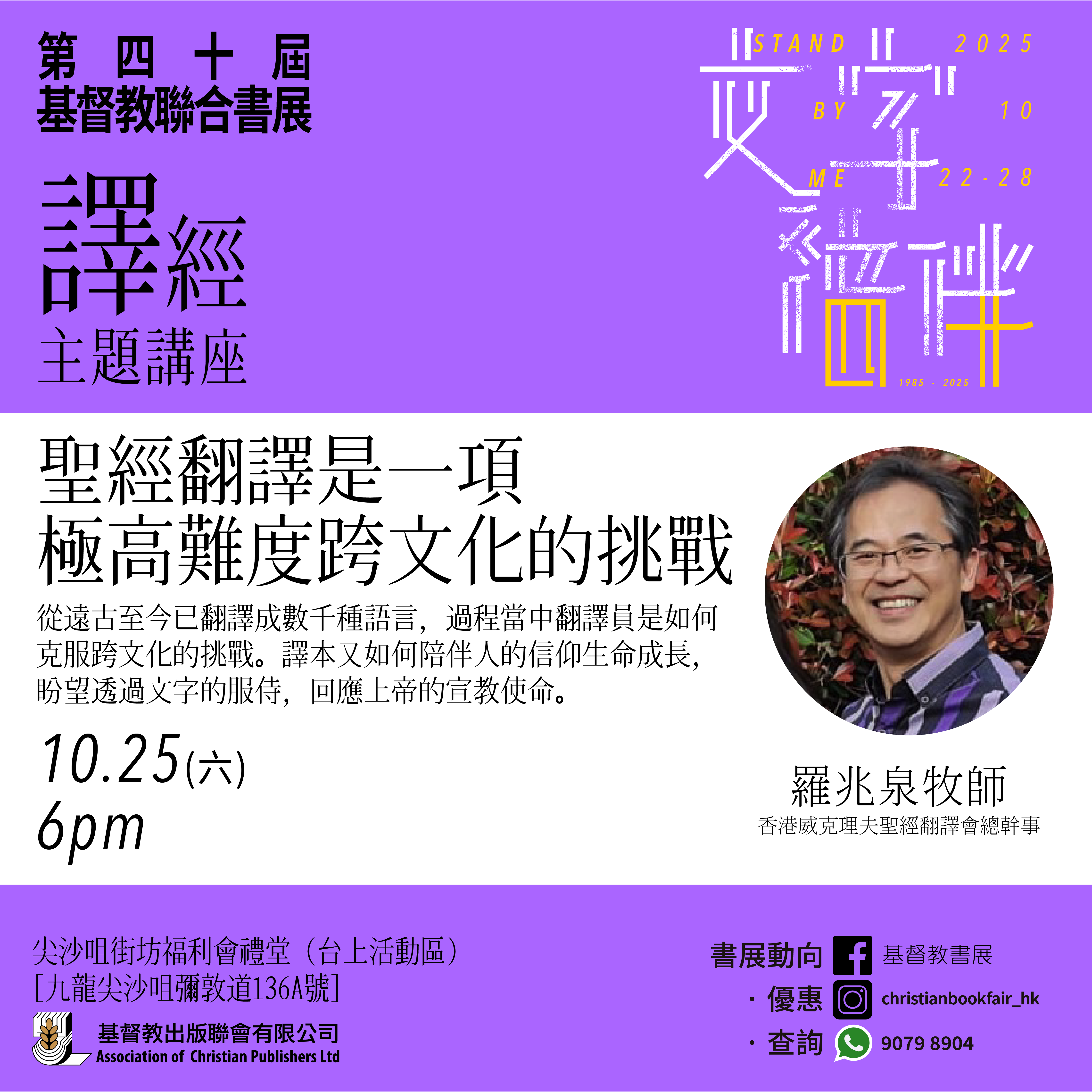 譯經主題︰聖經翻譯是一項極高難度跨文化的挑戰 Posted on 2025/09/25 by acpbookfair 2025年10月25日(六)18:00 – 18:45羅兆泉牧師(香港威克理夫聖經翻譯會總幹事)翻譯聖經是威克理夫其中一個標誌性的服侍,聖經是神的話,經歷數千年的洗禮,從遠古的希伯來文、亞蘭文和希臘文一直留存,現今已翻譯成數千種語言,過程當中翻譯員是如何克服跨文化的挑戰。當譯本出現後,它又如何陪伴不同時代人的信仰生命成長,盼望透過文字的服侍,回應上帝的宣教使命。 評分:分享此文:TweetPocket更多 按一下即可以電子郵件傳送連結給朋友(在新視窗中開啟) 電子郵件 點這裡列印(在新視窗中開啟) 列印 在 Tumblr 上分享喜歡 正在載入... 相關