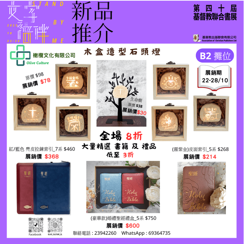 | 所有貨品及禮品八折 SR57ATTI4.101 (霧紫金)皮面索引_5系列和合本聖經 $268 /展銷價$214.4 SR57ARTIZ10P (豪華款)婚禮聖經禮盒_5系列和合本聖經 $750 /展銷價$600 SR77ATTIZ2.201 (藍銀)麂皮拉鍊索引_7系列和合本聖經 $460/展銷價$368 SR77ATTIZ3.101 (紅金)麂皮拉鍊索引_7系列和合本聖經 $460 /展銷價$368 957995985 生命樹飾品架 $38/展銷價$30 W960I201 有你真好/木盒造型石頭燈 $98/展銷價$78 W960I202 平靜安穩/木盒造型石頭燈$98/展銷價$78 W960I205 常常喜樂/木盒造型石頭燈$98/展銷價$78 W960I206 不住禱告/木盒造型石頭燈$98/展銷價$78 W960I207 十字架/木盒造型石頭燈$98/展銷價$78 W960I208 持續燃燒/木盒造型石頭燈$98/展銷價$78 https://youtu.be/aVnJyqdcO5o |