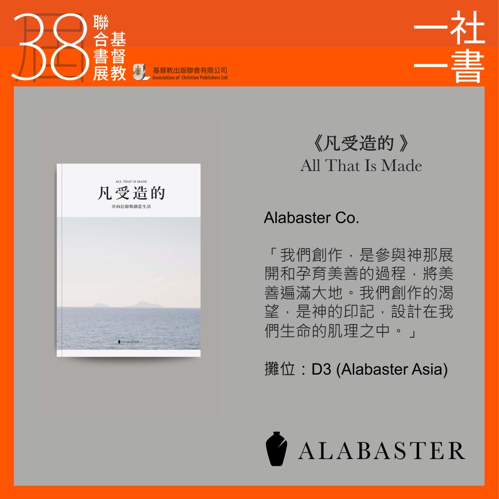 | 書籍/產品特點 | 《凡受造的》引領讀者探索創造力與信仰交集。 人類是具創造力的; 它是一種植根於我們存在結構中的品質,一種反映我們的存在是按照神的形象創造的現實。 這本書涵蓋了 Alabaster 過去四年作為一家創作公司的生活經驗。 第一個步驟就是要開展這對話,讓讀者在創造萬物的神的強大背景襯托下投入他們的信仰和創造力。 本書分為三個部份,包括《第一部分:創作者的禮儀》、《第二部分:成為創作者》及《第三部分:耶穌生命中的創意》 |