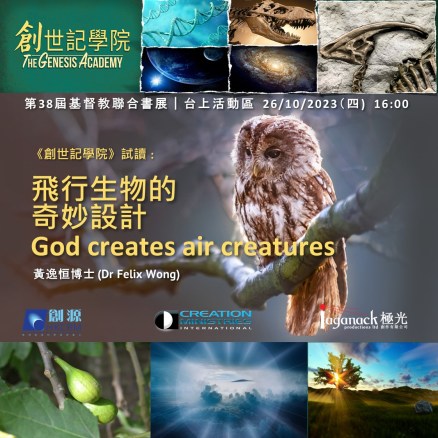 | 4:00-4:45 | 飛行生物的奇妙設計 | 許多基督徒渴望認識《創世記》更多,他們渴望接受裝備以回答傳福音遇到的聖經及科學問題。《創世記學院》課程正回應這需要。試讀會幫大家認識課程。 | ||