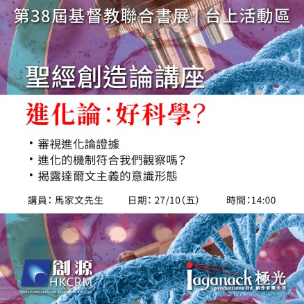 | 27/10 (五) | 2:00-2:45 | 進化論,好科學? | 籍《進化論,好科學?》書本介紹,審視進化論有爭議的證據,同時展示出科學數據與聖經所記載的創造一致,使讀者更有信心持守聖經是神的啟示、衪的創造、與人交往的真實紀錄。 | 馬家文先生 |