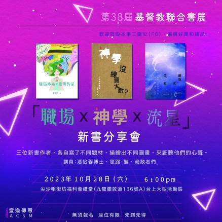 | 6:00-6:45 | 《職場X神學X流星》新書分享會 | 主題書籍 《職場姊妹的靈思雋語》、 《神學沒練習太耐?幻變尋求理解》、 《離散的流星——關於香港基督徒的雜思與告白》 三位新書作者,各自寫了不同題材,描繪出不同圖畫。來細聽他們的心聲。 | 潘怡蓉、思路.豐、流散者們 | |