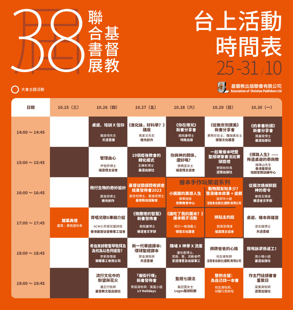 | 30/10 (一) | 2:00-2:45 | 《約拿書析讀》新書分享會 | 介紹新書 | 黃嘉樑博士 |