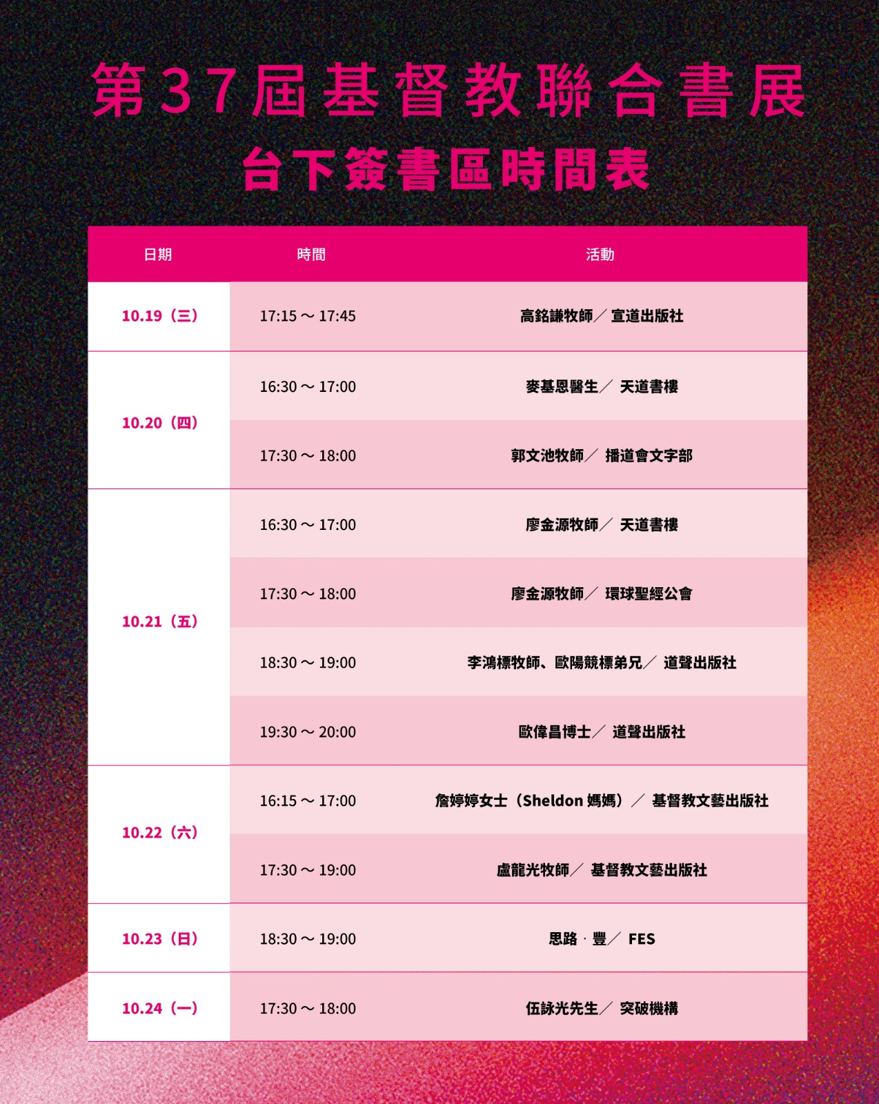 簽書區時間表 基督教聯合書展2022 評分:分享此文:TweetPocket更多 按一下即可以電子郵件傳送連結給朋友(在新視窗中開啟) 電子郵件 點這裡列印(在新視窗中開啟) 列印 在 Tumblr 上分享喜歡 正在載入...