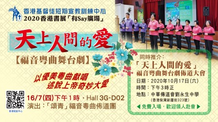 「天上人間的愛」福音粵曲舞臺劇 Posted on 2020/06/01 by acpbookfair 香港書展2020|基督教坊有SAY廣場(Hall 3G-D02) 7月16日(四) 下午1:00-1:30 ▍「天上人間的愛」福音粵曲舞臺劇 主講:短宣中心同工 內容:介紹「天上人間的愛」福音粵曲舞台劇佈道大會,將於今年10月17日(六)再度公演,並即場獻唱其中一些曲目。 負責機構:香港基督徒短期宣教訓練中心(3G-D16) 分享此文:TweetPocket更多 按一下即可以電子郵件傳送連結給朋友(在新視窗中開啟) 電子郵件 點這裡列印(在新視窗中開啟) 列印 在 Tumblr 上分享喜歡 正在載入...
