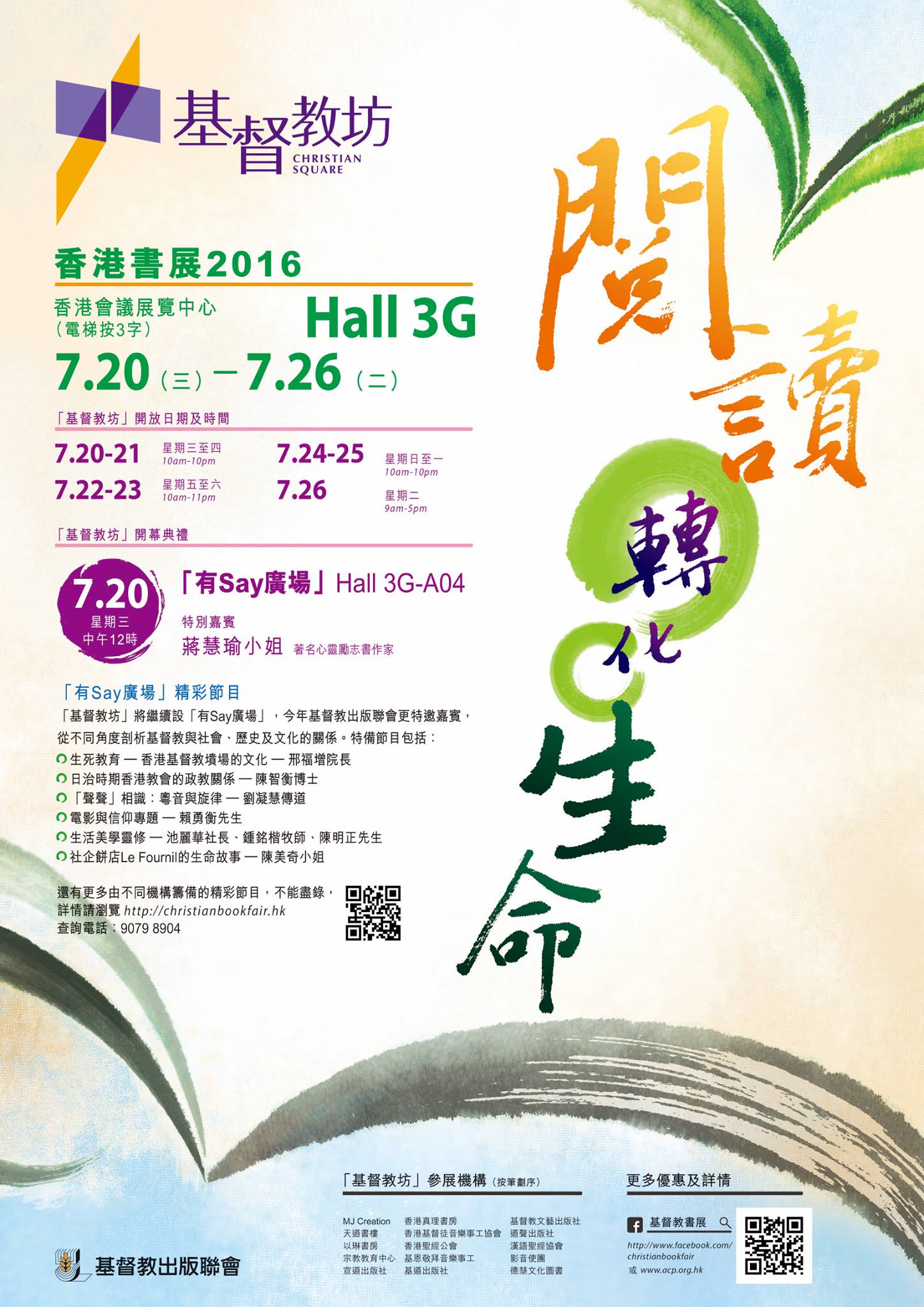 香港書展2016「基督教坊」以「閱讀轉化生命」為主題,並配搭「有Say廣場」活動,期望弟兄姊妹透過不同活動、文化講座及交流,更能體會閱讀的意義,及其與福音大使命間和生命造就的關係。
