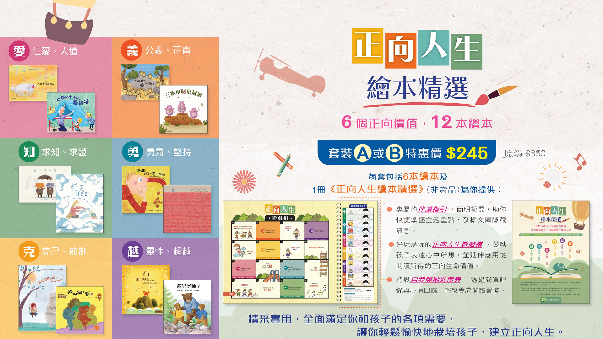 「正向人生繪本精選」運用六個正向價值,挑選十二本優質繪本,並提供專屬的「伴讀指引」,好玩易玩的「正向人生遊戲棋」,更特設「自我獎勵進度表」,精采實用,全面滿足你和孩子的各項需要,讓你輕鬆愉快地栽培孩子,建立正向人生。