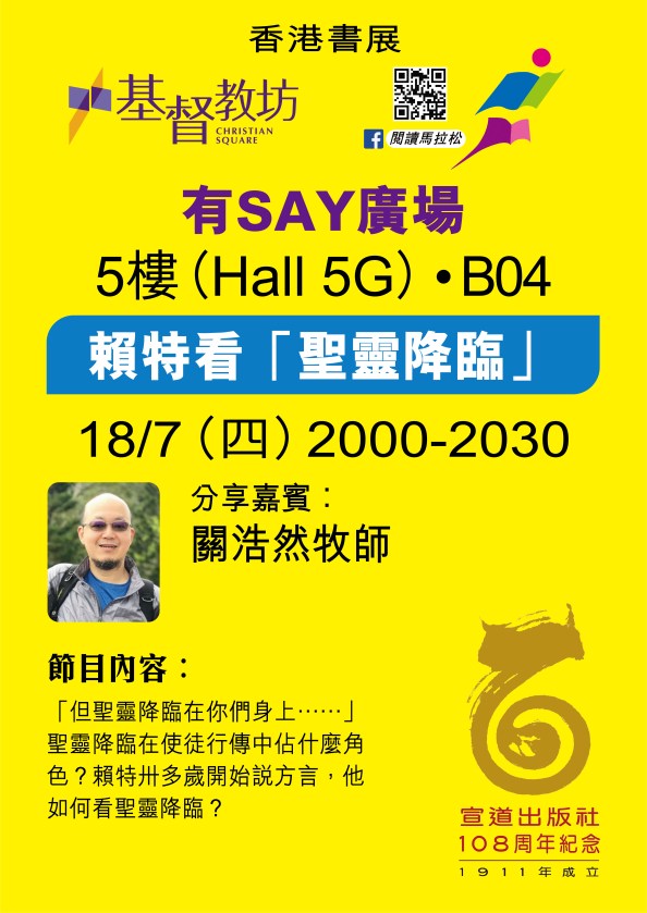 賴特看「聖靈降臨」(20190718|2000-2030) Posted on 2019/06/01 by acpbookfair 主題:賴特看「聖靈降臨」 日期:20190718 時間:20:00-20:30 機構:宣道出版社 嘉賓:關浩然牧師 活動內容: 「但聖靈降臨在你們身上……」聖靈降臨在使徒行傳中佔什麼角色?賴特卅多歲開始說方言,他如何看聖靈降臨? 分享此文:TweetPocket更多 以電子郵件將連結傳送給朋友(在新視窗中開啟) 電子郵件 列印(在新視窗中開啟) 列印 在 Tumblr 上分享喜歡 正在載入...